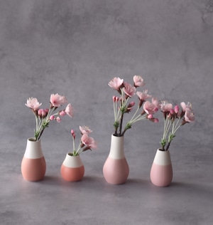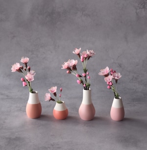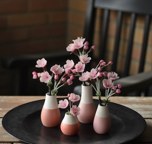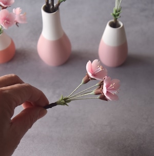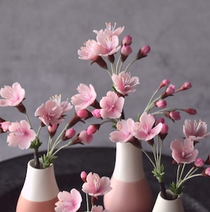 粘土で桜の花をつくり、コロリとした形の小さな花器に活けました。