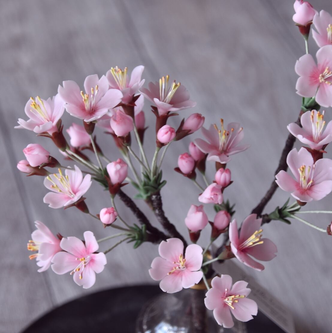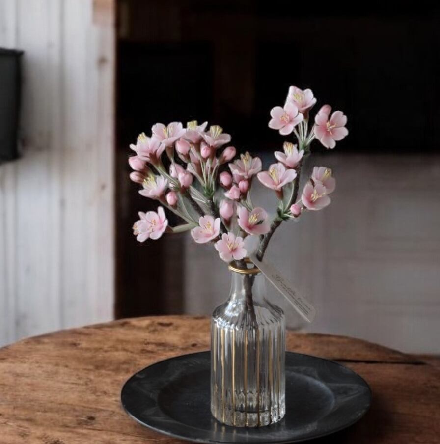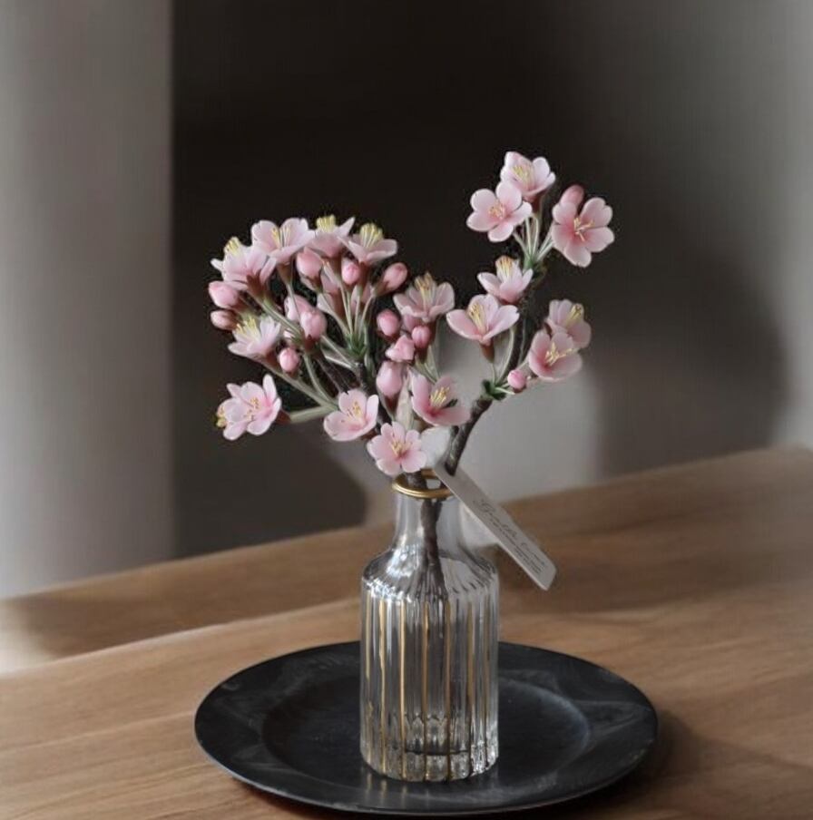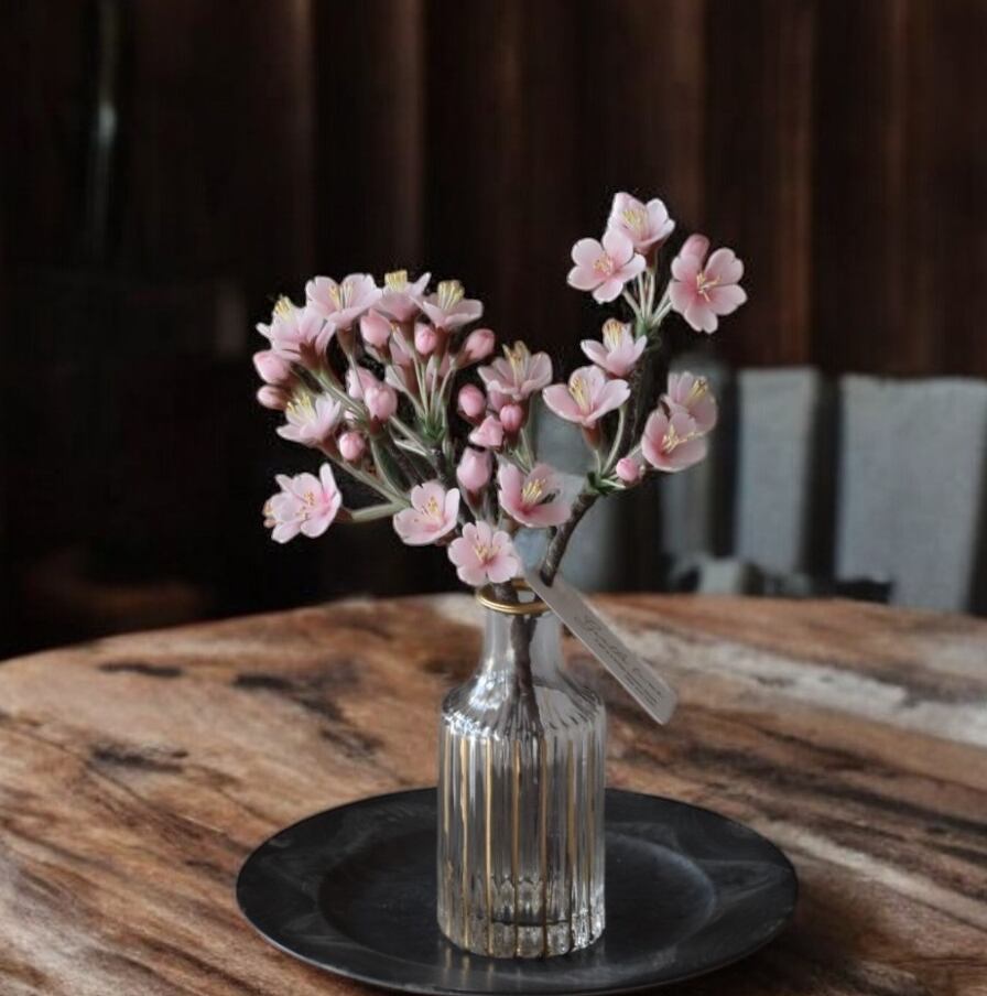 粘土で桜をつくり、おしやれなフラワーベースに活けました。