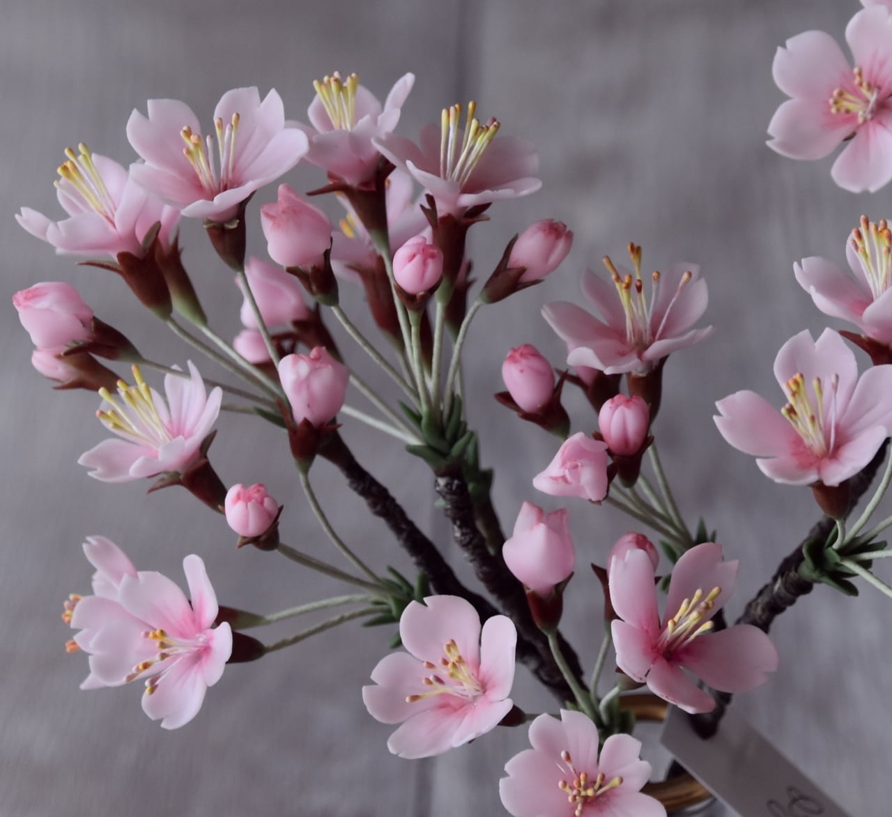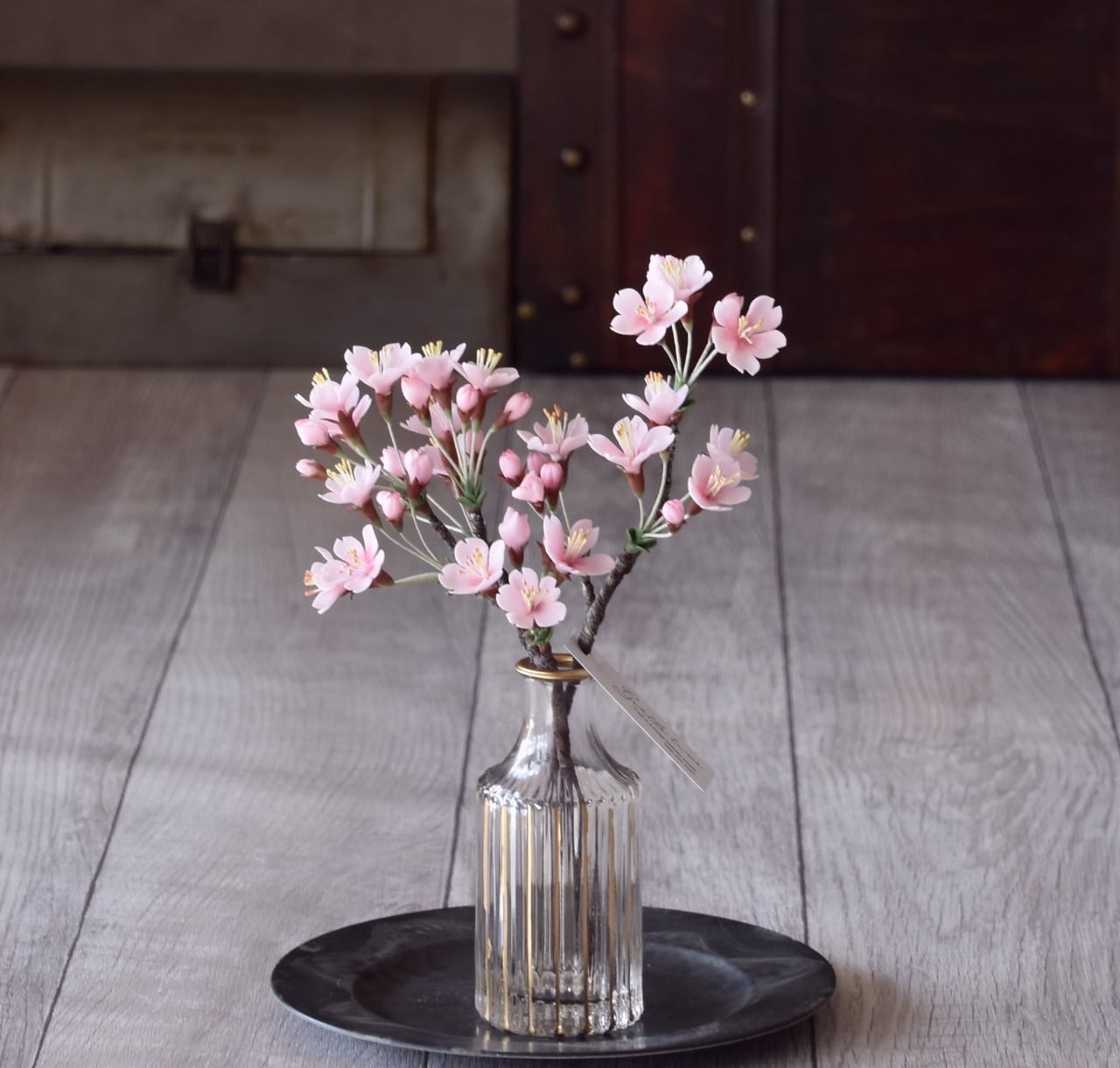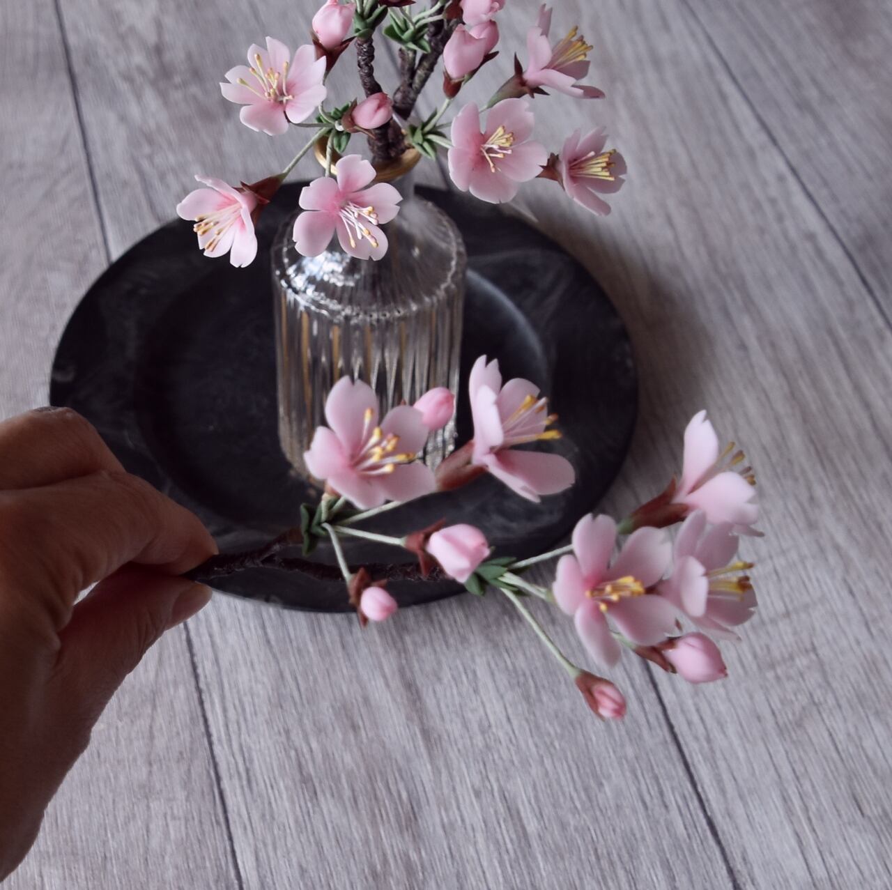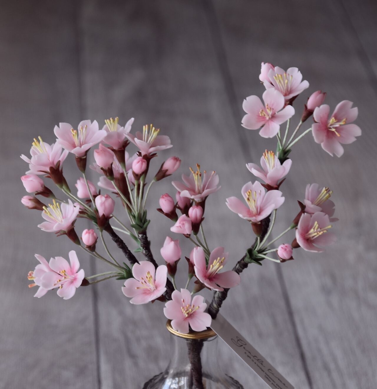 粘土で桜をつくり、おしやれなフラワーベースに活けました。
