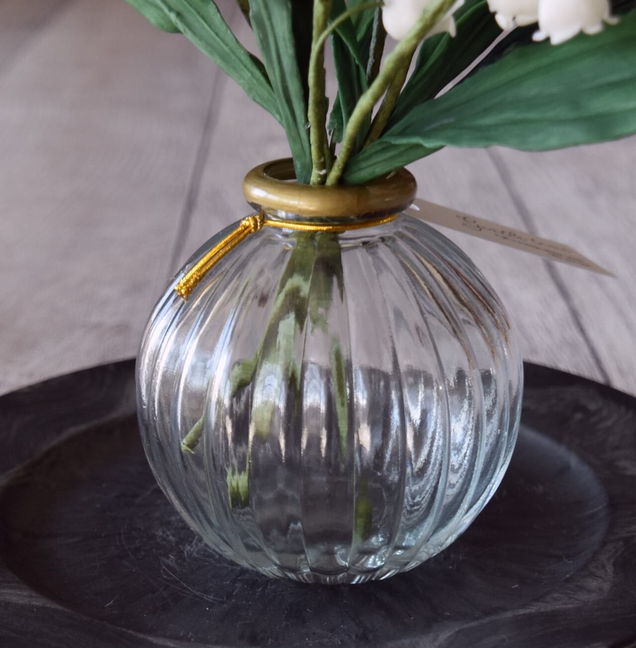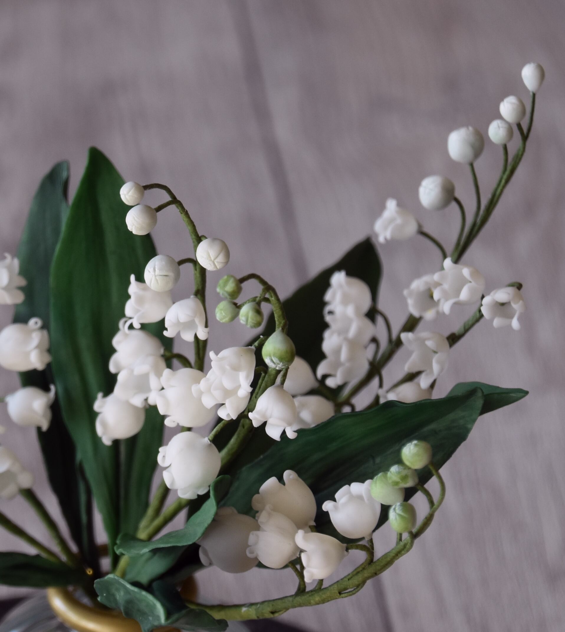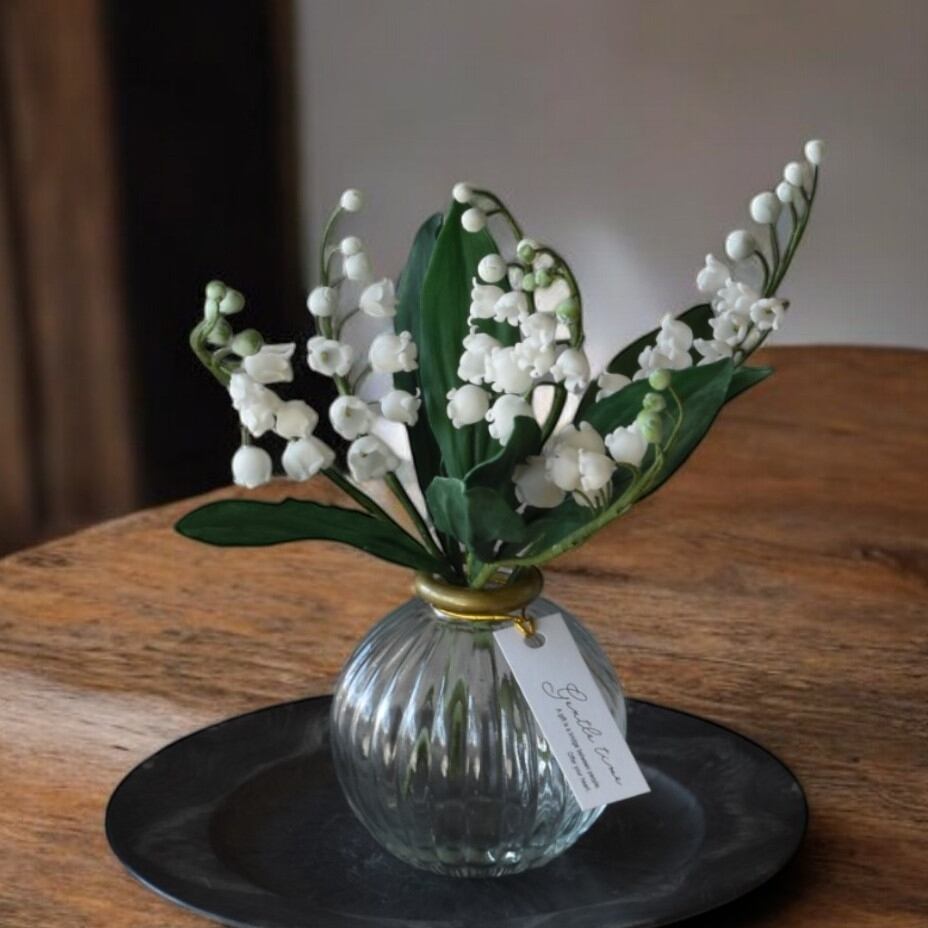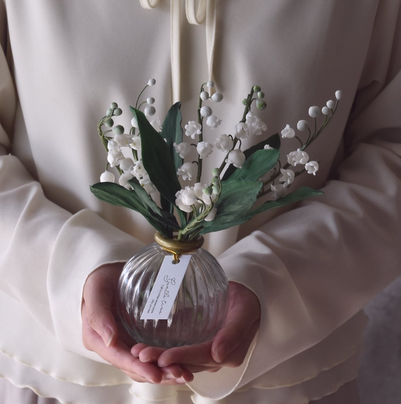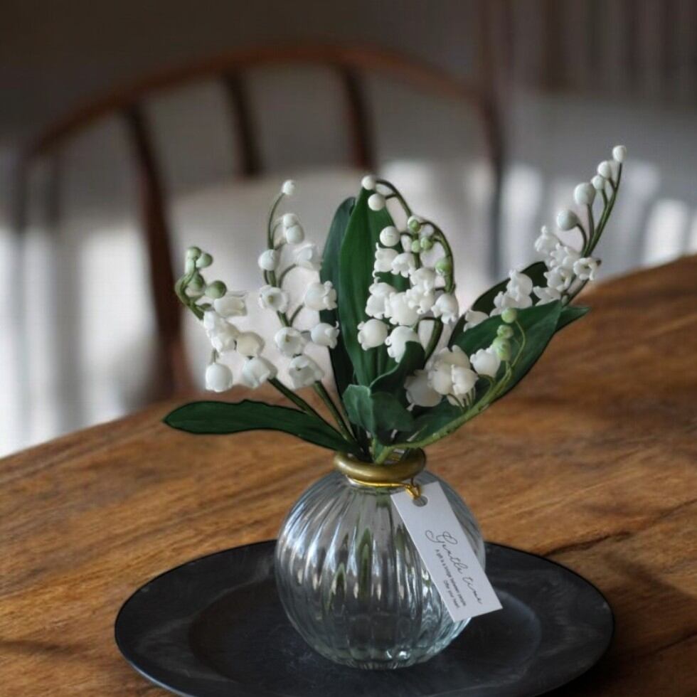 花器の口部分がゴールドで縁取られており、シンプルでエレガントな花瓶はスズランの花の可憐な美しさを引き立ててくれます。