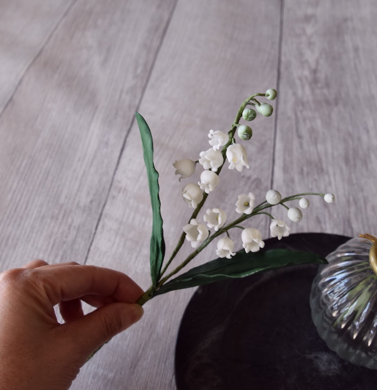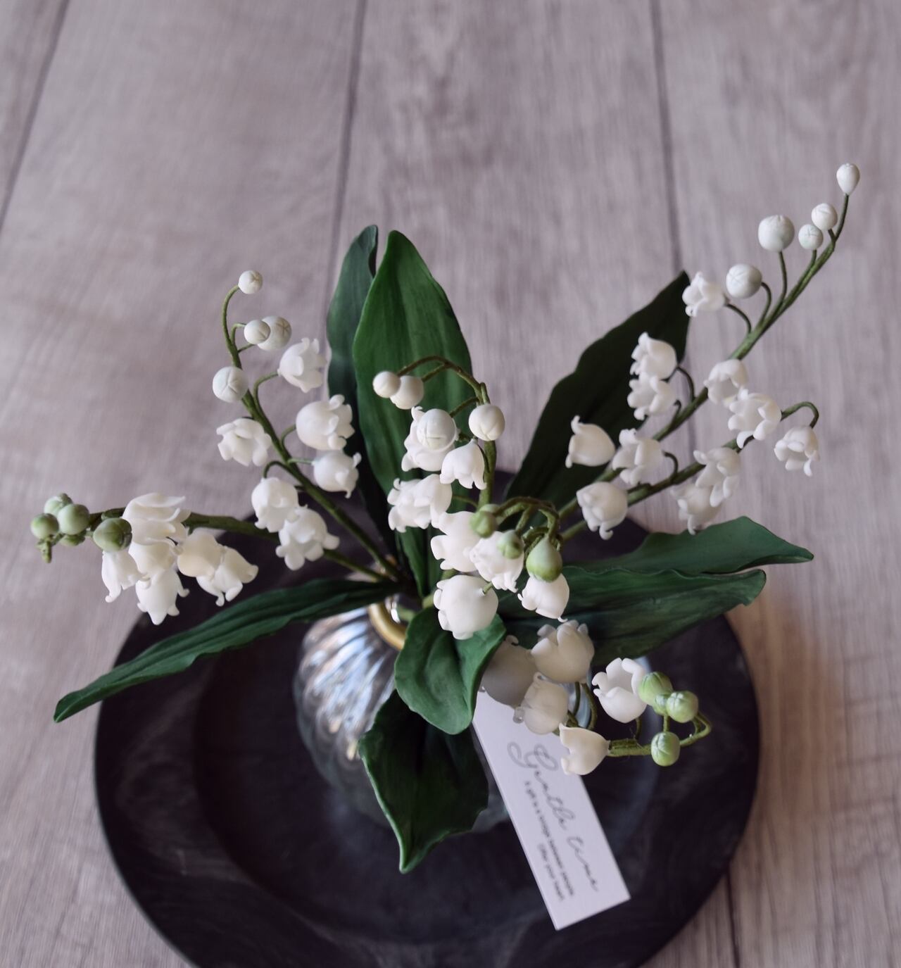 粘土でスズランをつくり、ぽってりとまあるいフォルムのフラワーボトルに活けました。