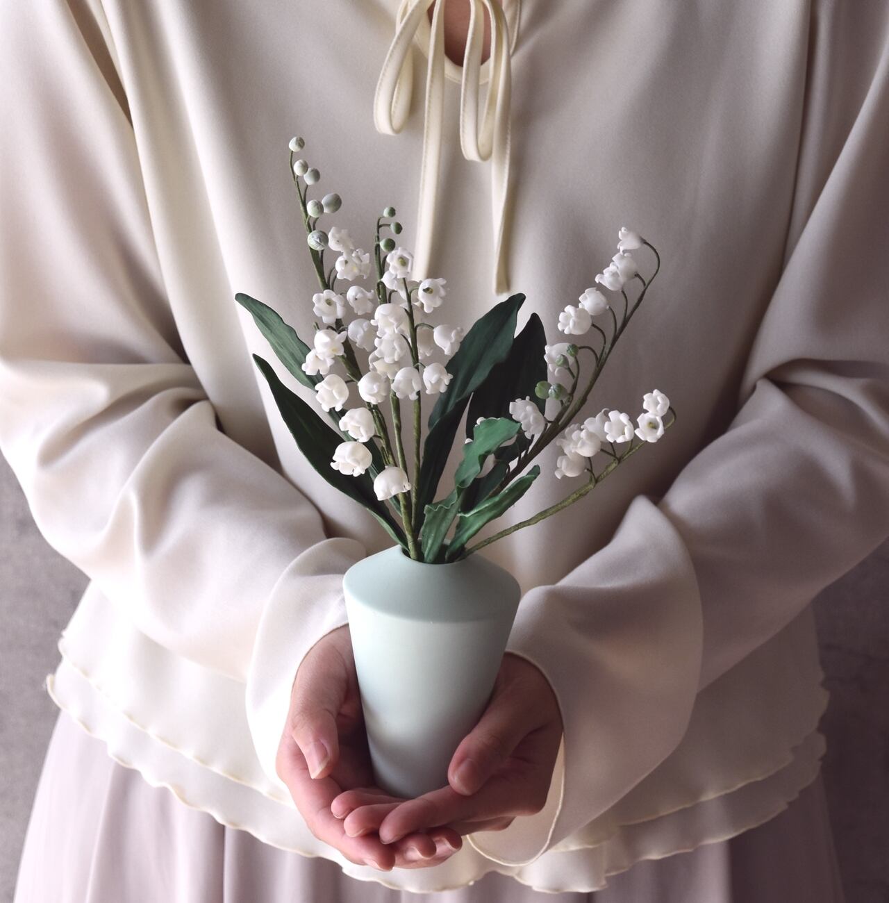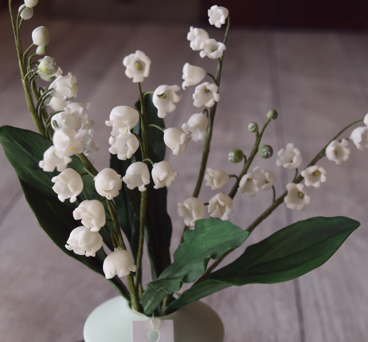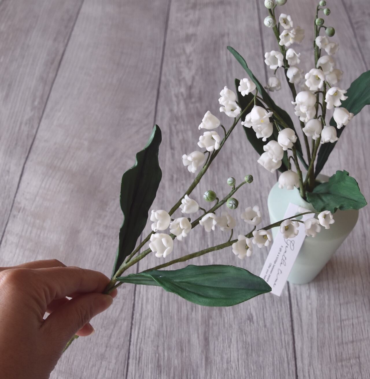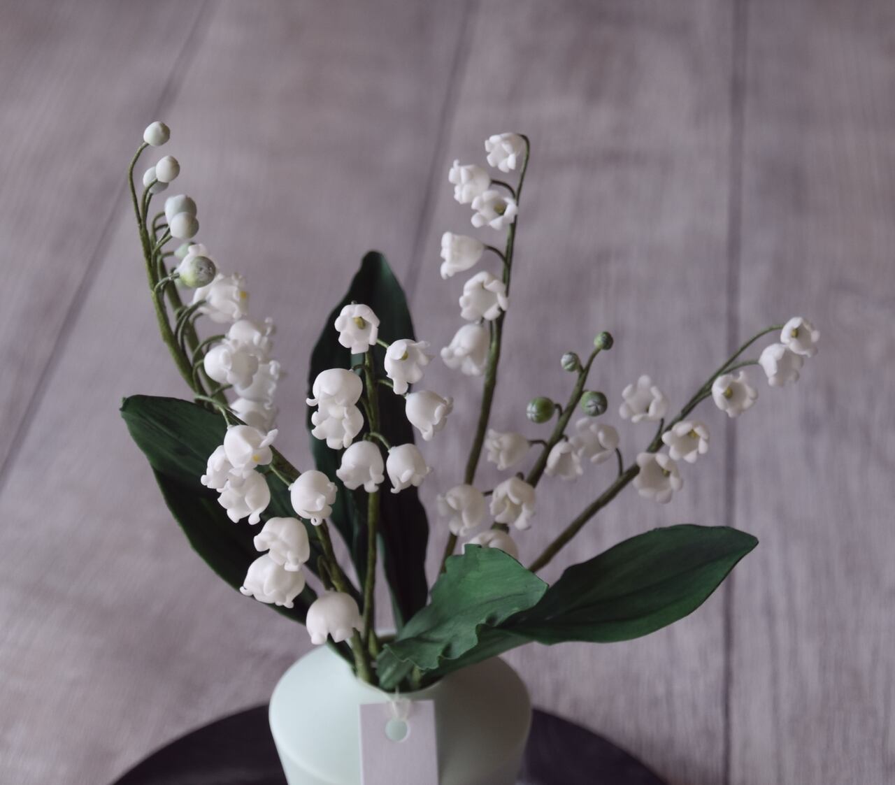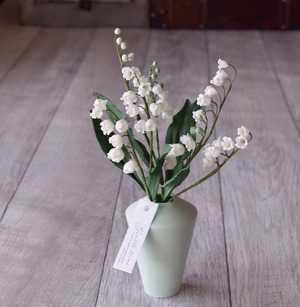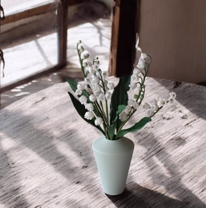 粘土でスズランをつくり、シンプルなフォルムのフラワーボトルに活けました。