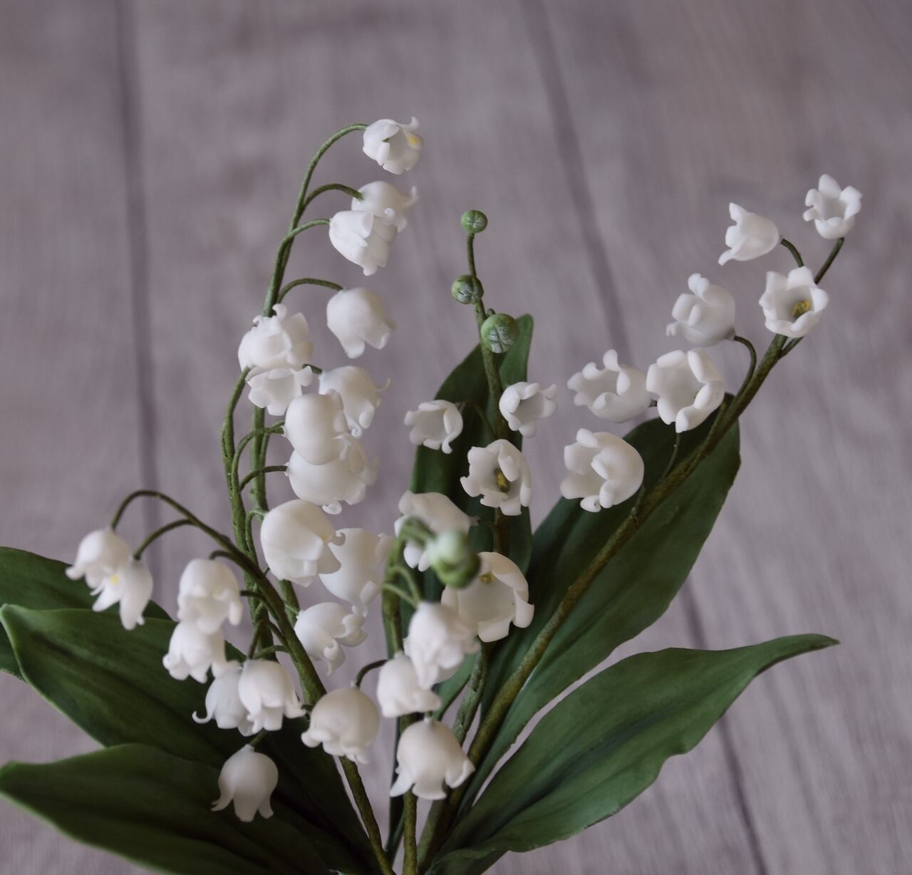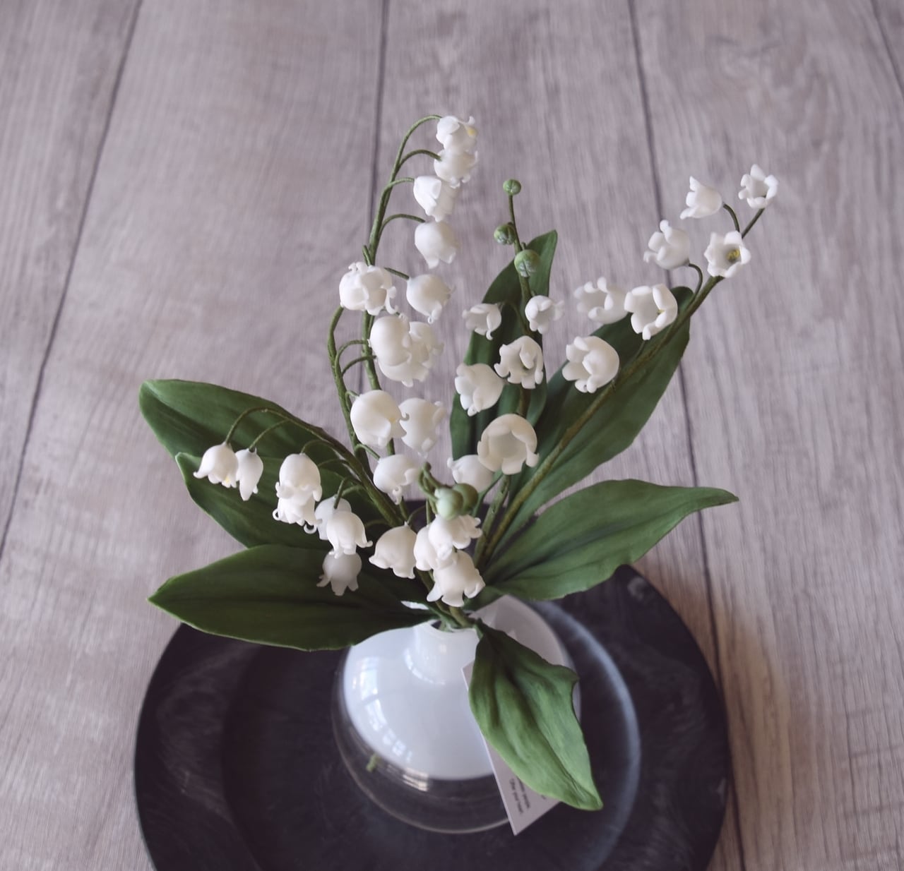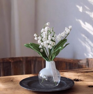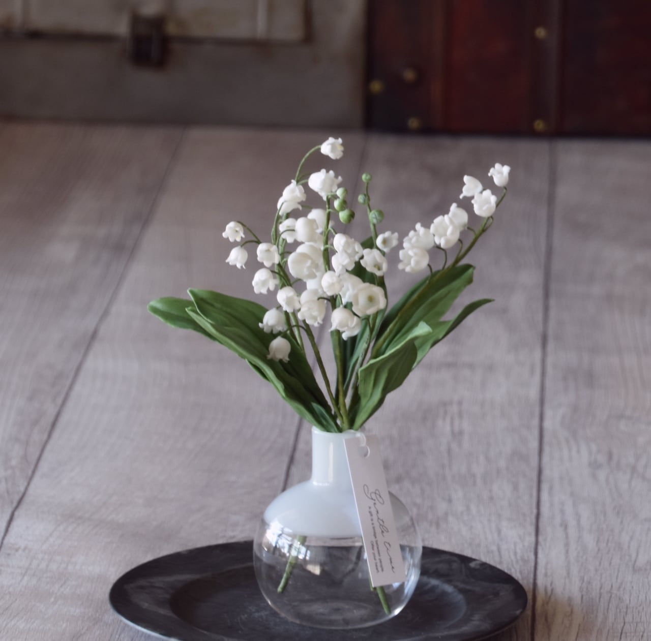 粘土でスズランをつくり、美しい造形が人気のフラワーボトルに活けました。
