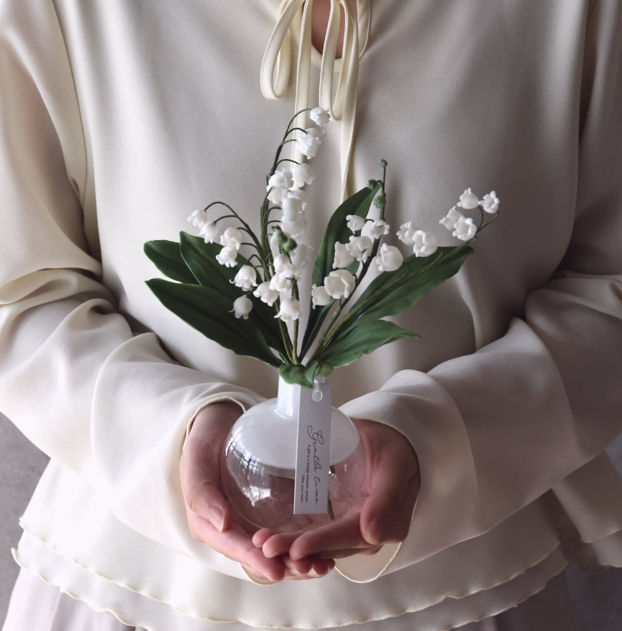 シンプルなデザインのフラワーボトルは、上部がホワイトで、スズランの爽やかな美しさを引き立ててくれます。
